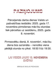 Pārceļamās darba dienas Valsts un pašvaldības iestādēs: 2025. gada 17. novembra pirmdienas mācību stundas tiek pārceltas uz sestdienu, 2025. gada […]