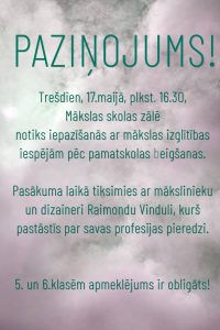 19. un 26. maijā Jēkabpils mākslas skolas audzēkņiem nenotiek stundas! Sakarā ar to, ka 6.klasēm 19.05. – noslēguma darba aizstāvēšana