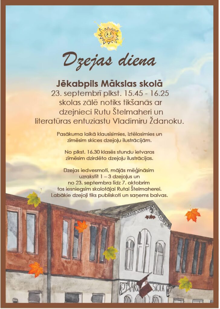23. septembrī plkst. 15.45 – 16.25 skolas zālē notiks tikšanās ar dzejnieci Rutu Štelmaheri un literatūras entuziastu Vladimiru Ždanoku. Pasākuma laikā klausīsimies, iztēlosimies un zīmēsim skices dzejoļu ilustrācijām.